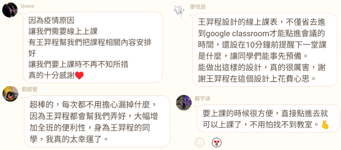 之前線上上課要找課程連結總是很麻煩,於是線上課表誕生了!它能在上課前10分鐘,為你自動導向上課的連結(比如:具會議代碼google meet),讓你只需要按加入就能上課!此線上課表也收穫同學好評!(附件:09)